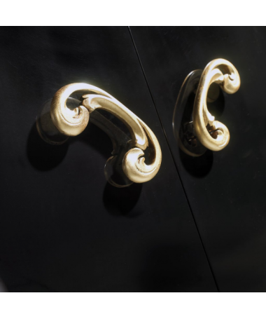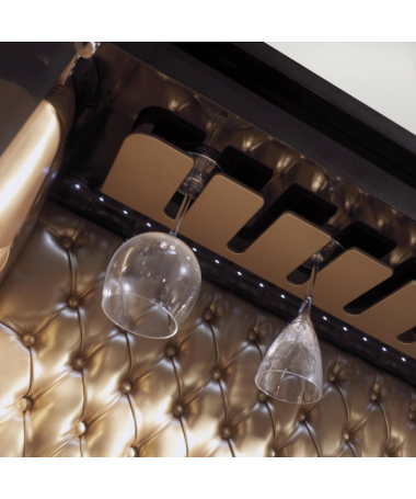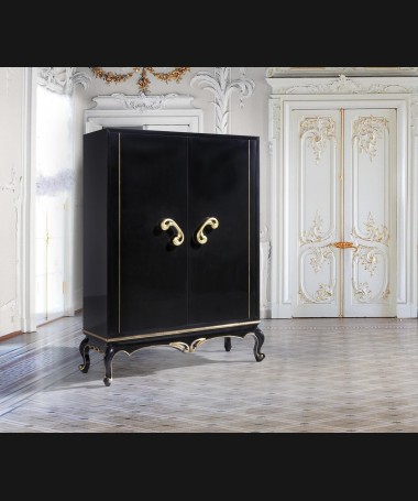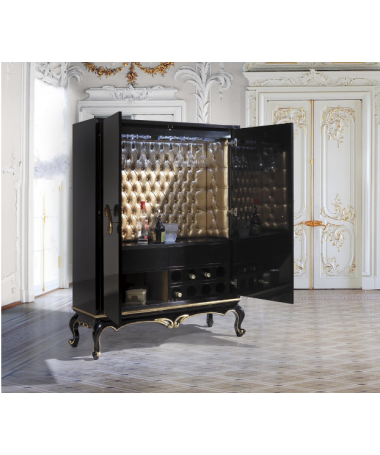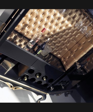 - Mueble bar modelo PMB0013, de estilo clásico hecho a medida, lacado en negro alto brillo y dorado, con el interior tapizado en polipiel