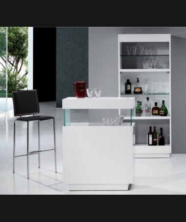 - Mueble bar modelo PMB0016, de estilo moderno hecho a medida, lacado en blanco con detalles de cristal, compuesto por la barra con vitrina y mueble bar trasero (taburete no incluido)