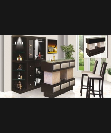 - Mueble bar modelo PMB0018, de estilo moderno hecho a medida, en madera de castaño en color chocolate con detalles tapizados, en acero y piezas de cristal, compuesto por barra, mueble bar trasero y dos taburetes