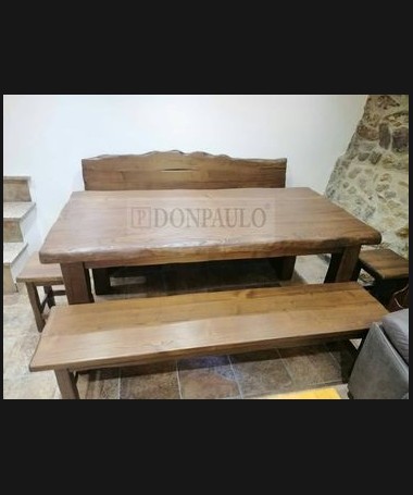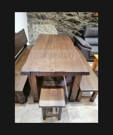 - Mesa con bancos modelo TRU0006, de estilo rústico hecho a medida, en madera 100% maciza de castaño francés en acabado envejecido. Compuesto por mesa fija con escaño, banco y taburete