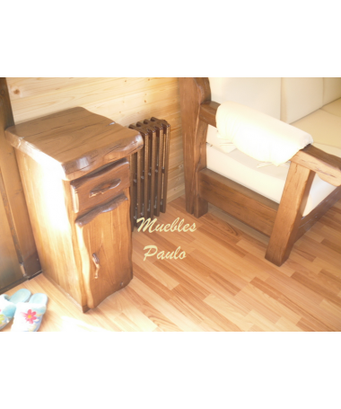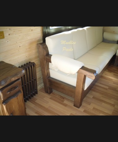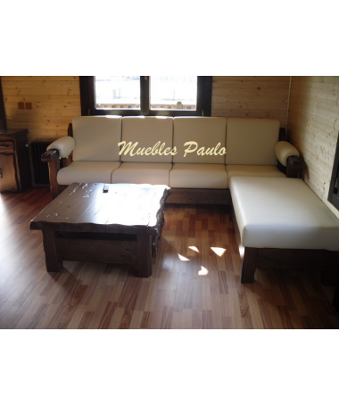 - Sofá con puff modelo TSO0066, de estilo rústico hecho a medida, en madera de castaño 100% maciza, tapizado en polipiel beige
