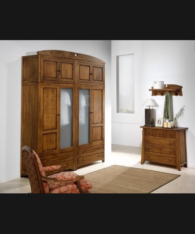 - Armario rústico modelo PRUAR0002, de estilo rústico hecho a medida, en madera con los tiradores de forja, cajones exteriores, dos puertas de cristal e interior personalizado