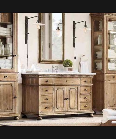 Mueble de baño rústico modelo PRUBA0006, de estilo rústico hecho a medida, en madera en acabado envejecido, con dos vitrinas a juego y espejo