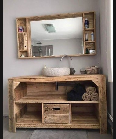 - Mueble de baño rústico modelo PRUBA0008, de estilo rústico hecho a medida, en madera en acabado envejecido, con espejo a juego