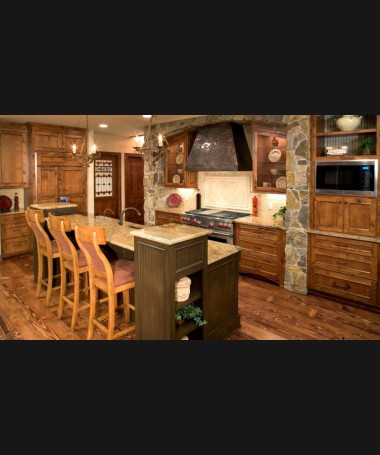 - Cocina rústica modelo PRUCC0006, de estilo rústico hecho a medida, en madera en acabado envejecido con taburetes altos en la isla