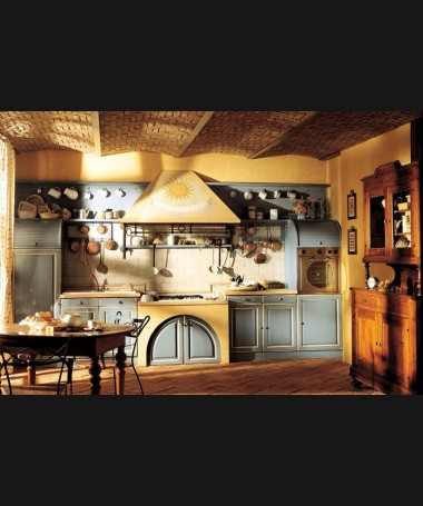 - Cocina rústica modelo PRUCC0009, de estilo rústico hecha a medida, en madera en acabado azul envejecido y color madera