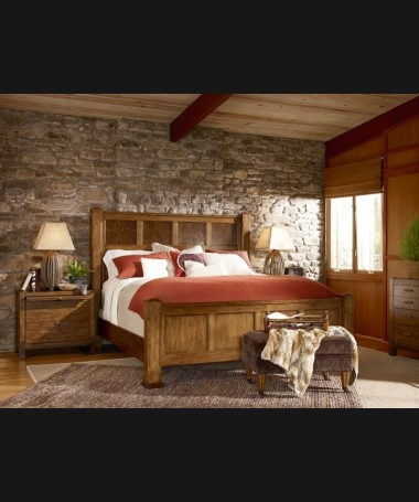 - Dormitorio rústico modelo PRUDO0008, de estilo rústico hecho a medida, en madera en acabado envejecido. Compuesto por cama de matrimonio, dos mesitas, cómoda y banqueta a juego