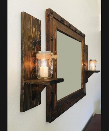 - Espejo rústico modelo PRUES0003, de estilo rústico hecho a medida, en madera, con detalles en forja y dos estanterías a los lados