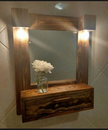 - Espejo rústico modelo PRUES0004, de estilo rústico hecho a medida, en madera en acabado envejecido, con hueco para colocar apliques y consola debajo