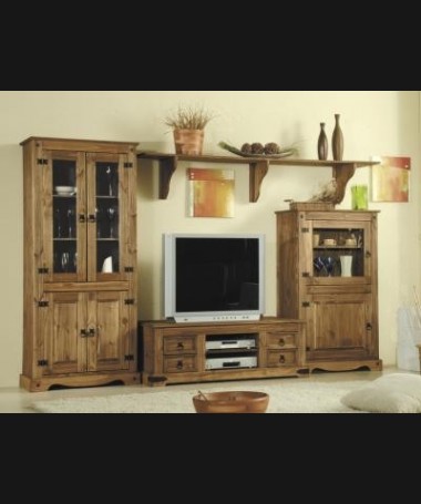 - Salón rústico modelo PRUSA0001, de estilo rústico hecho a medida, en madera en acabado envejecido con herrajes de forja