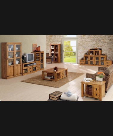 - Salón rústico modelo PRUSA0004, de estilo rústico hecho a medida, en madera en acabado envejecido, con herrajes de forja negra