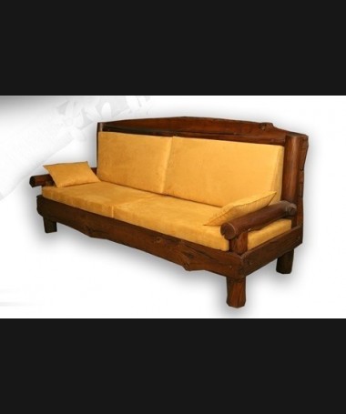 - Sofá rústico modelo PRUSO0001, de estilo rústico hecho a medida, en madera maciza de castaño en acabado envejecido y tapizado en tela de microfibras de fácil limpieza. De 3 plazas