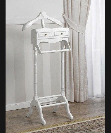 - Galán modelo PPE0007, de estilo clásico hecho a medida, lacado en blanco, con dos cajones, perchero para chaquetas, colgardor para pantalones y abajo para colocar zapatos