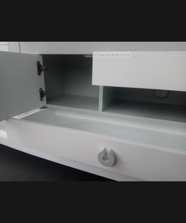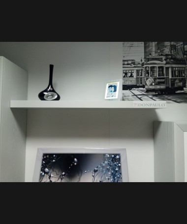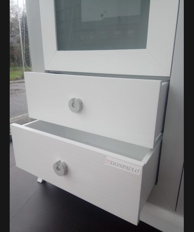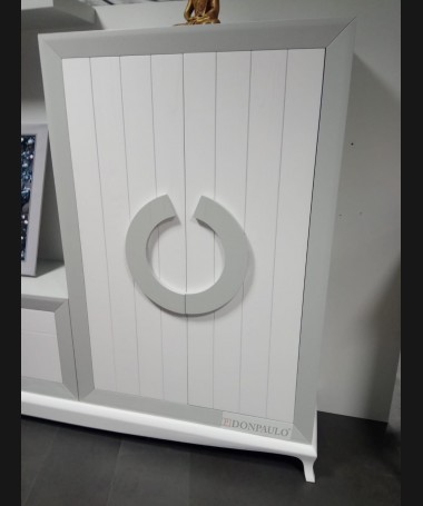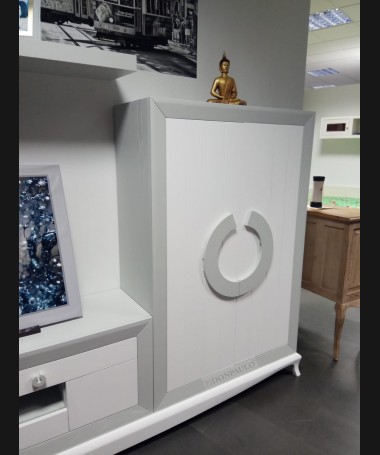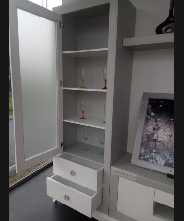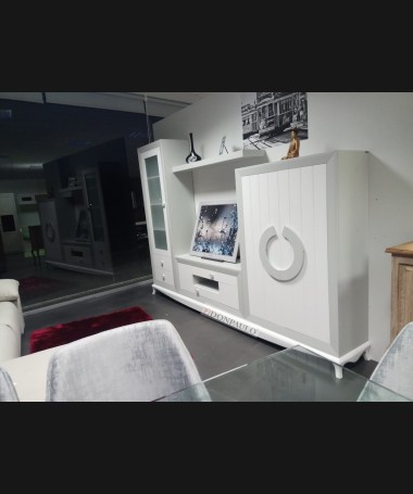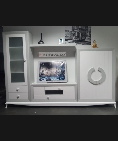 - Salón modelo ESA0035, de estilo moderno hecho a medida, en madera en acabado decapado blanco con los detalles en decapé gris RAL 7035, de L306 x F43 x A210 cm, compuesto por:
