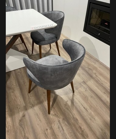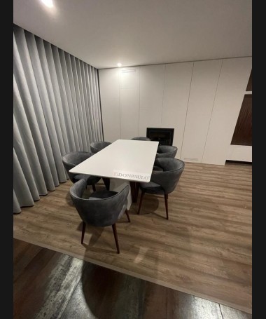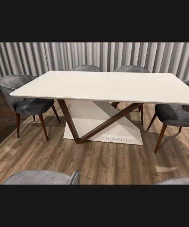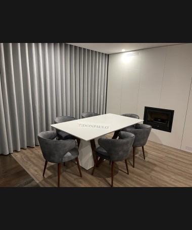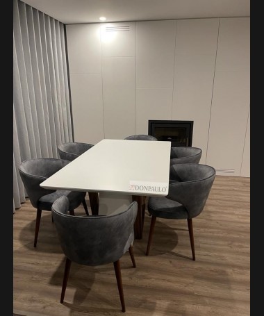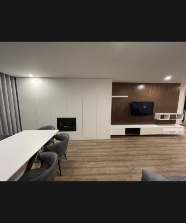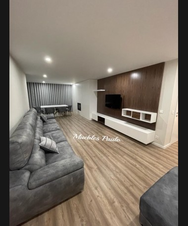 - Salón modelo TSA0013, de estilo moderno hecho a medida, en blanco y color nogal con el comedor y el sofá a juego