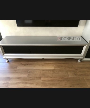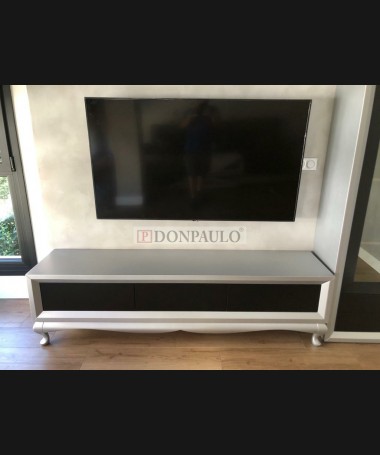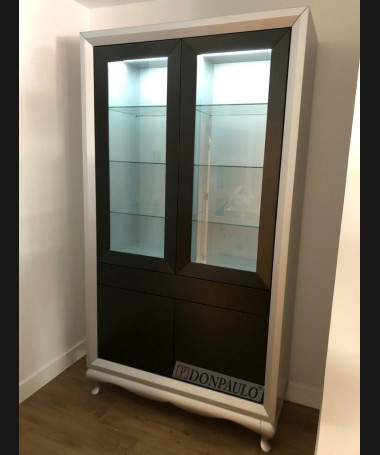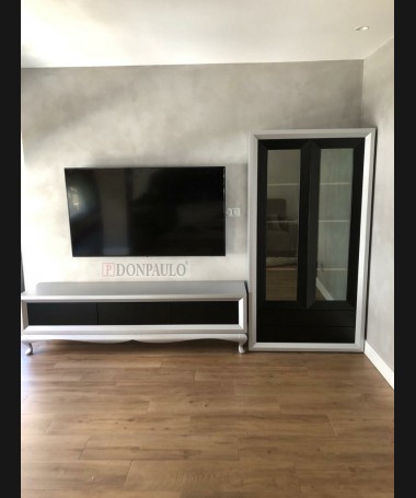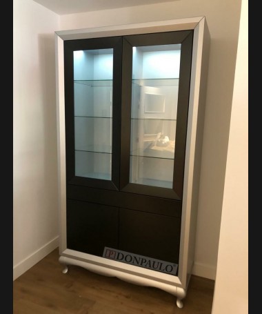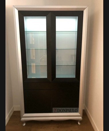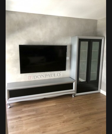 - Salón modelo TSA0015, de estilo moderno hecho a medida, lacado en gris plata y negro, con led en la vitrina