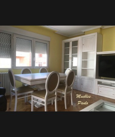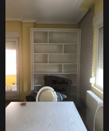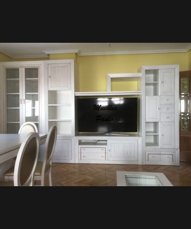 - Salón modelo TSA0040, de estilo moderno hecho a medida, en madera, en acabado decapado blanco con la beta y los detalles dorados. Compuesto por mueble de salón, mesa de centro, mesa de comedor, 6 sillas tapizadas en polipiel dorada, y librería a juego