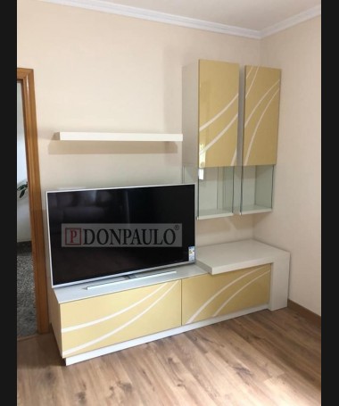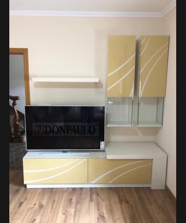 - Salón modelo TSA0048, de estilo moderno hecho a medida, lacado en blanco y beige alto brillo, compuesto por mueble de televisión, balda colgada y dos columnas