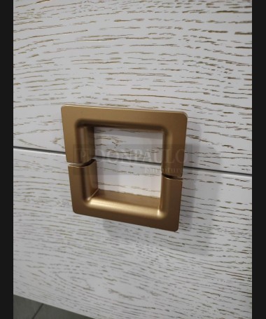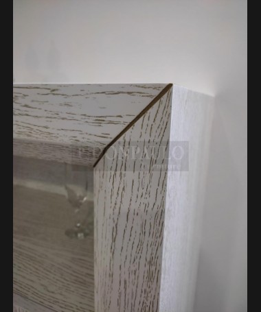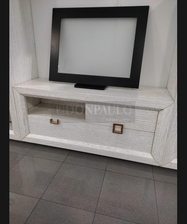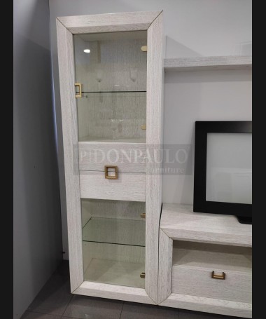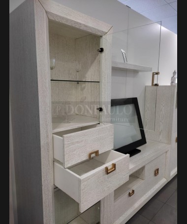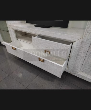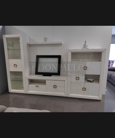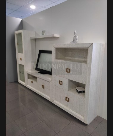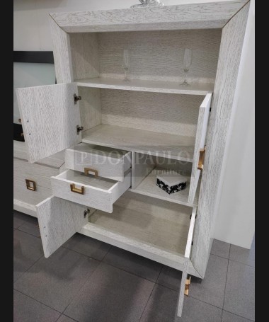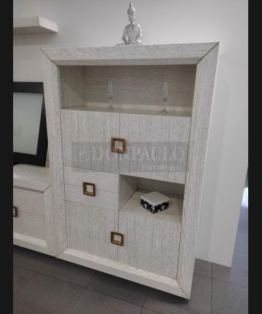 - Salón modelo ESA0038, de estilo moderno hecho a medida, en madera de castaño en acabado decapé blanco con la beta dorada. Con los tiradores dorados, de L305 x F45 x A195,5 cm: