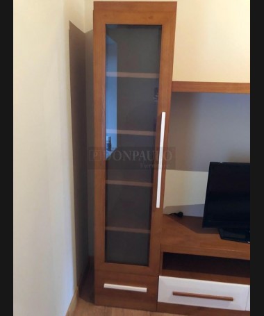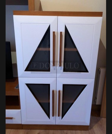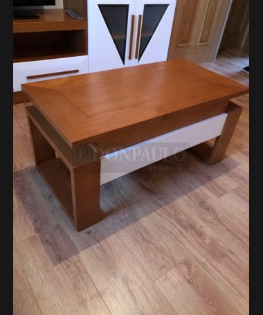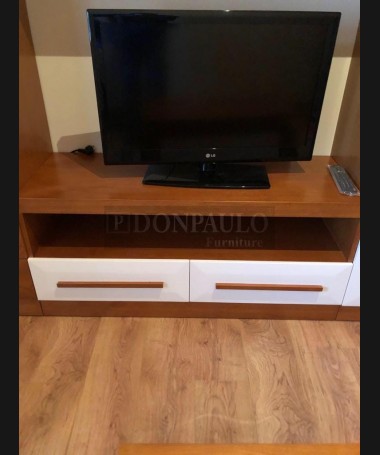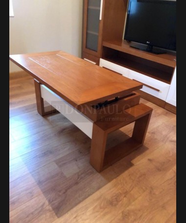 - Salón modelo TSA0054, de estilo moderno hecho a medida, en madera de castaño en acabado color am con los frentes en blanco. Con la mesa de centro a juego