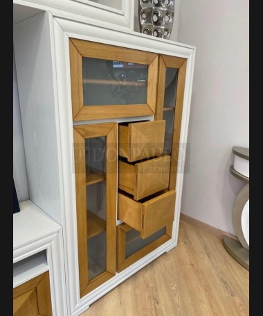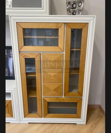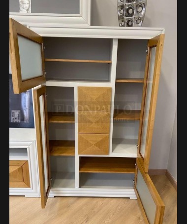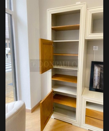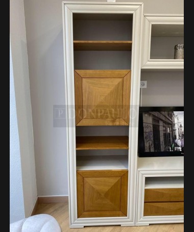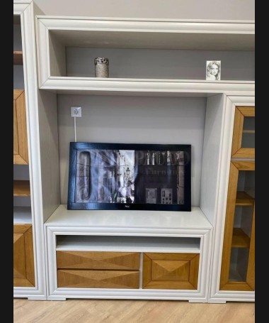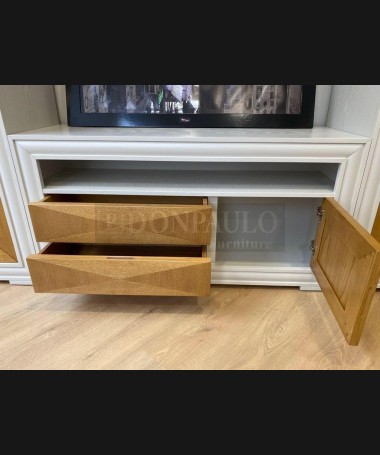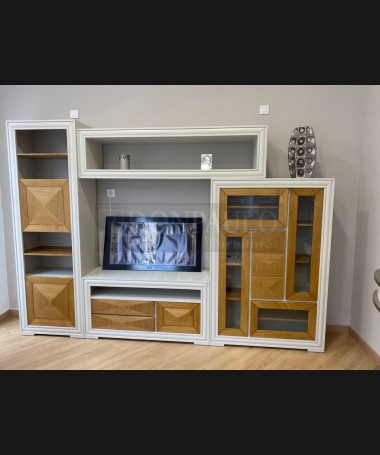 - Mueble de salón modelo Lusango ESA0047, en madera de castaño en acabado decapado RAL9002, con los frentes en color alemán con sombras. De L310 x F42,5 x A220 cm