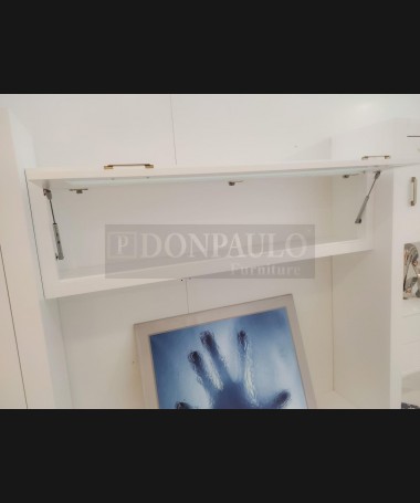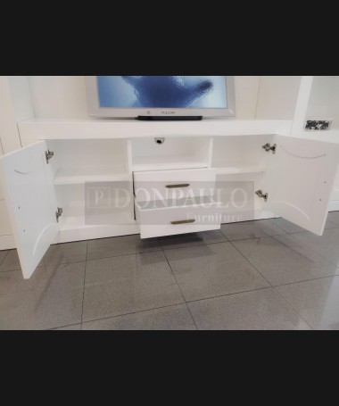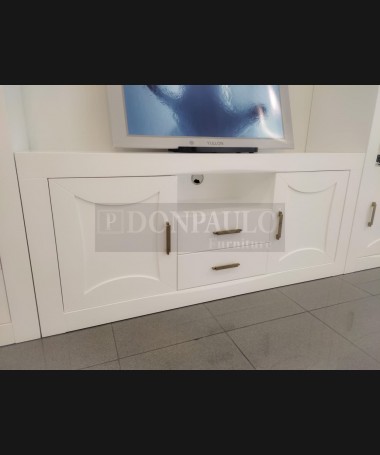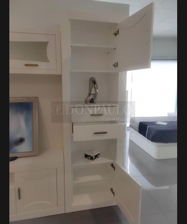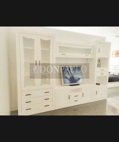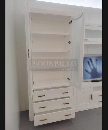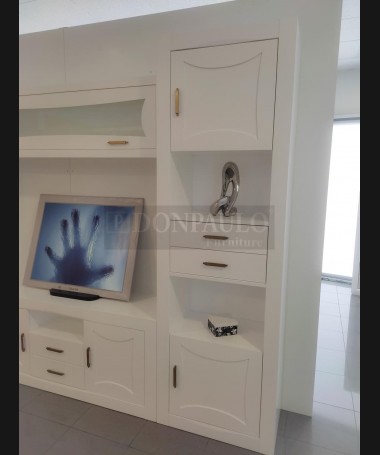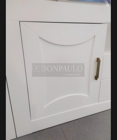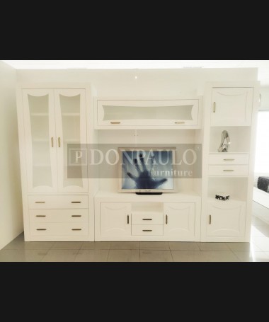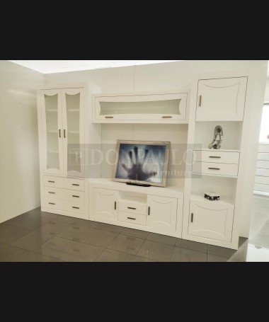 - Salón modelo ESA0052, de estilo moderno hecho a medida, en madera de castaño en acabado decapado blanco, de L320 x F40 x A220 cm, compuesto por: