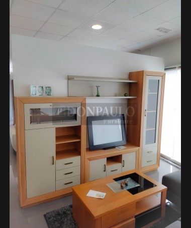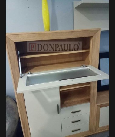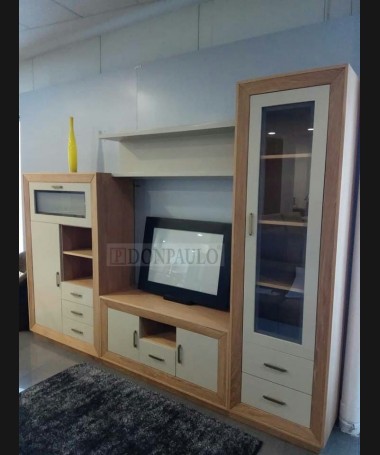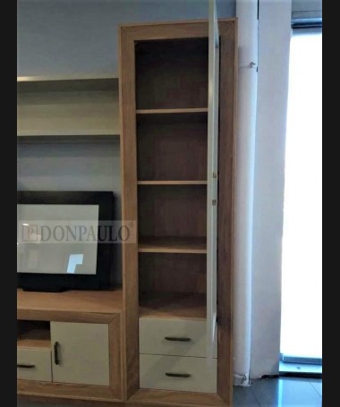 - Salón modelo ESA0015, en roble mate profundo con los frentes en DM hidrófugo lacado en color vainilla mate, hecho a medida, de L280 x F42 x A210 cm. Compuesto por: