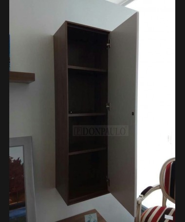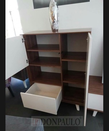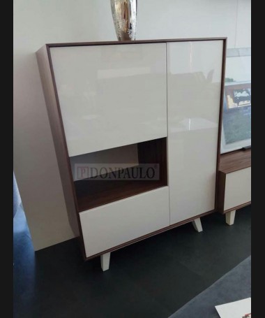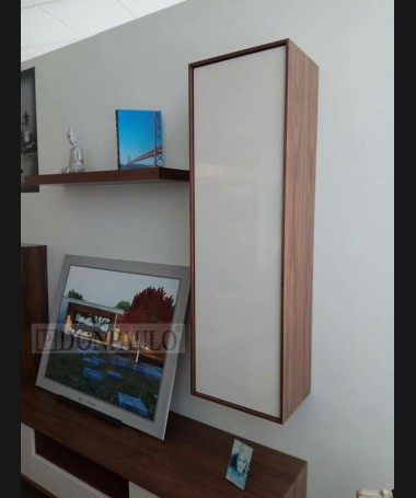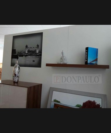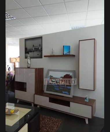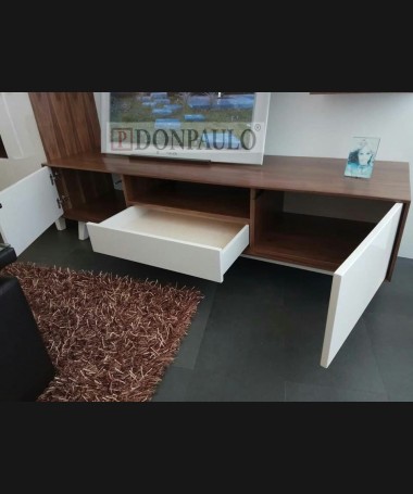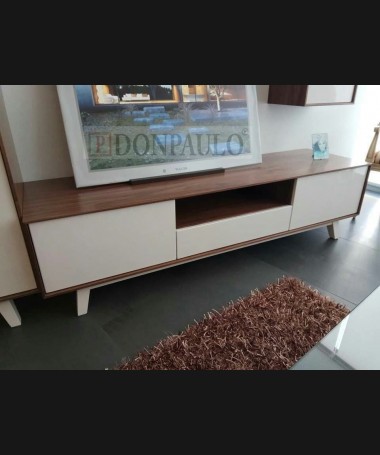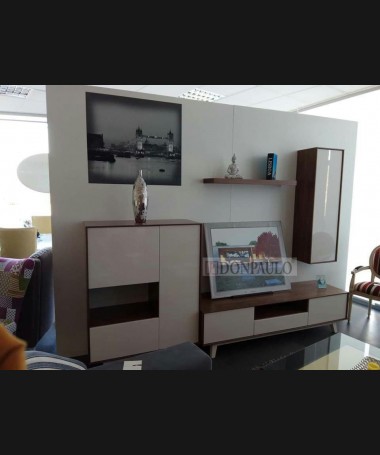 - Salón modelo ESA0023, en nogal mate, con los frentes en DM hidrófugo lacados en blanco alto brillo, de L280 x F50 cm, compuesto por: