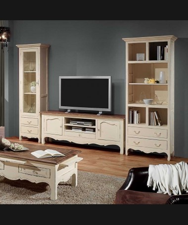 - Salón modelo PSA0001, de estilo clásico hecho a medida, en madera de cerezo en acabado efecto anticuario, compuesto por 3 módulos y mesa de centro