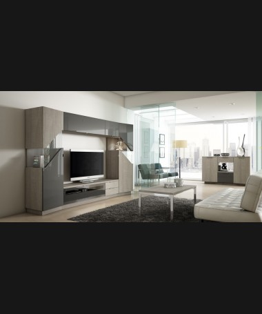 - Salón modelo PSA0012, de estilo moderno hecho a medida, en madera y lacado en gris, con aparador y mesa de centro a juego