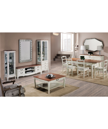 - Salón modelo PSA0013, de estilo clásico hecho a medida, en madera de cerezo en acabado efecto anticuario, con mesa de centro y comedor a juego