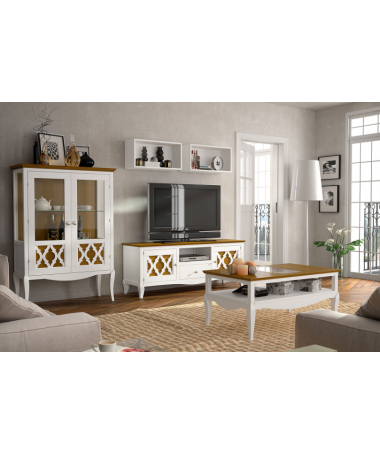 - Salón modelo PSA0017, de estilo clásico hecho a medida, lacado en blanco con detalles en color madera, con mesa de centro a juego