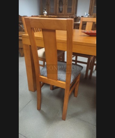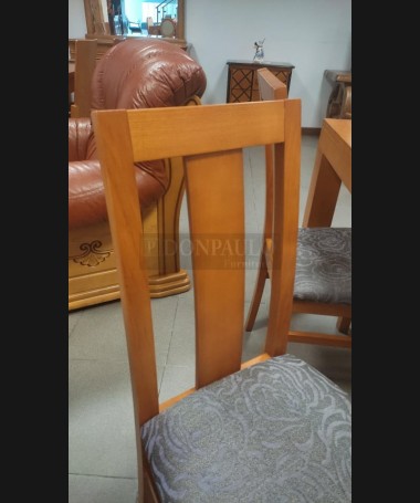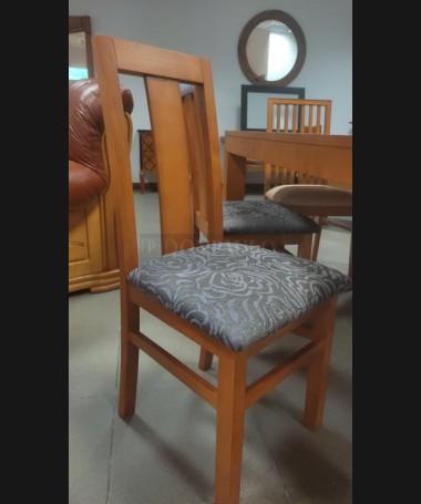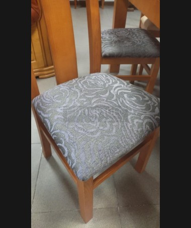 - Silla modelo ES0002, de estilo clásico, en madera de castaño color am, tapizada en tela estampada gris, de L45 x F46 x A98 cm