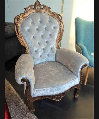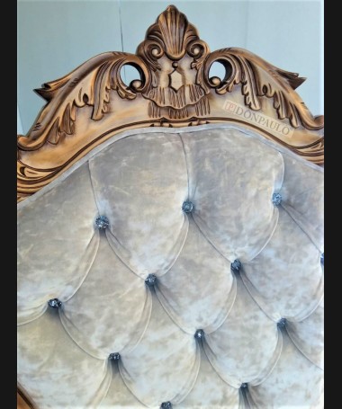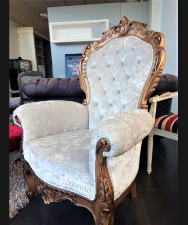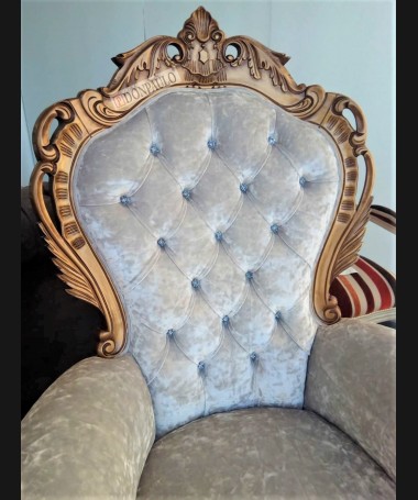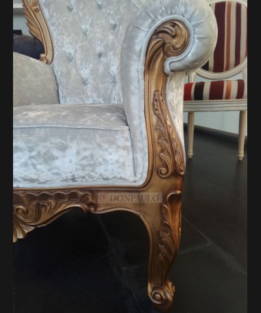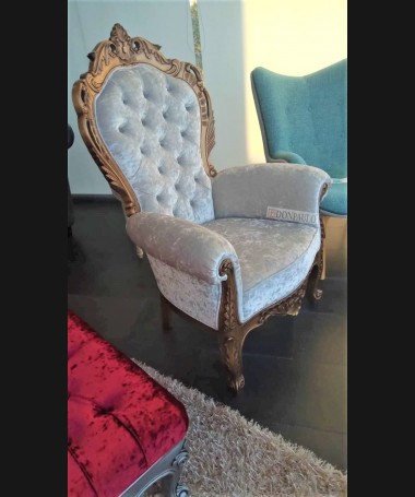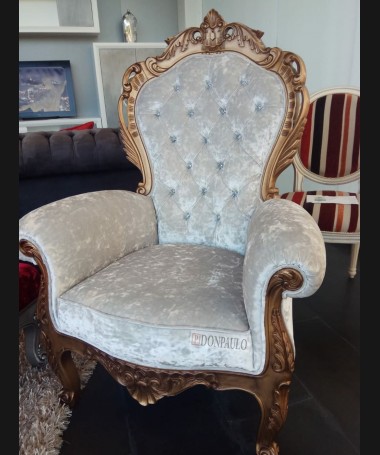 - Sillón modelo ES0012, de estilo clásico hecho a medida, en madera tallada, en acabado lacado dorado envejecido, tapizado en terciopelo blanco con el respaldo de capitoné y los botones de cristal. De L88 x F70 x A124 cm