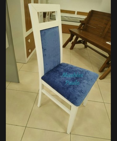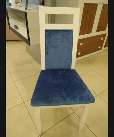 - Silla modelo ES0013, de estilo moderno, en madera en acabado decapado blanco, tapizada en terciopelo azul. De L47 x F54 x A102 cm
