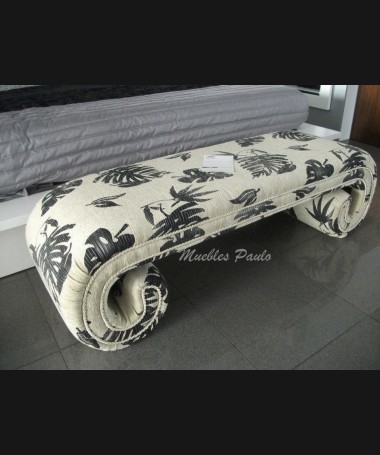 - Banqueta caracol modelo ES0017, de estilo moderno hecho a medida, tapizado en tela beige estampada en negro. De L120 x F40 x A36 cm