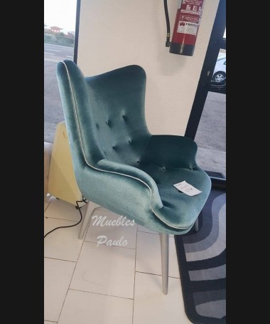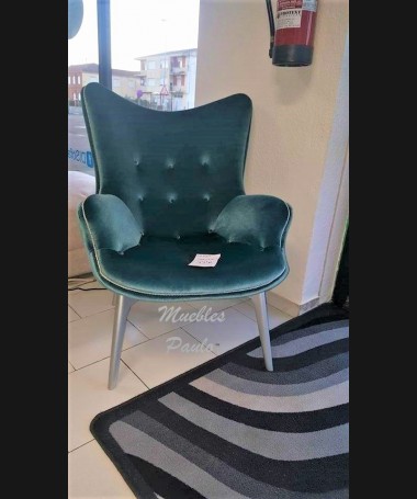 - Sillón modelo ES0027, de estilo moderno, con las patas lacadas en color plata y tapizado en terciopelo verde. De L80 x F85 x A100 cm