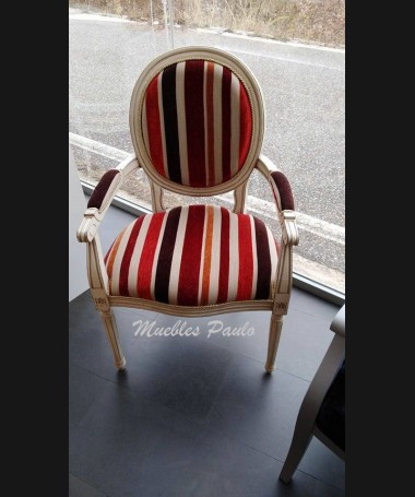 - Sillón modelo ES0033 , de estilo clásico, en madera de cerezo en acabado efecto anticuario tallada, tapizada en tela de rayas de colores. De L45 x F55 x A105 cm