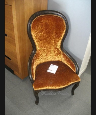 - Sillón modelo ES0040, de estilo clásico, hecho en madera de castaño en acabado color chocolate craquelado, tapizado en terciopelo naranja. De L62 x F55 x A100 cm