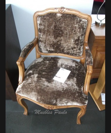 - Sillón modelo ES0041, de estilo clásico, fabricado en madera de castaño tallado, en acabado color alemán patinado, tapizado en terciopelo marrón. De L60 x F55 x A93 cm