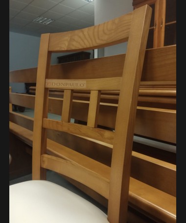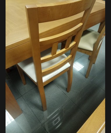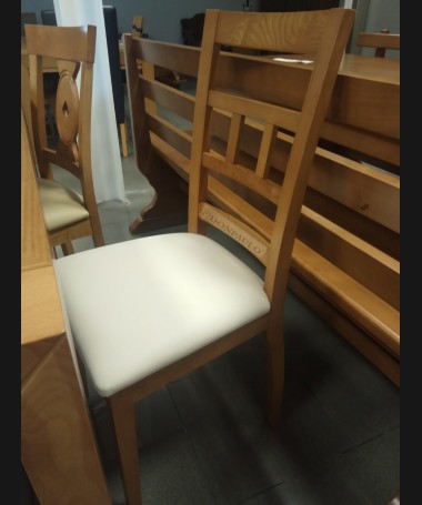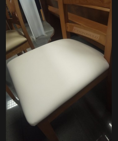 - Silla modelo ES0048, de estilo moderno, en madera en acabado color roble, tapizada en polipiel blanca. De L46 x F50 x A99,5 cm