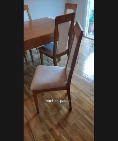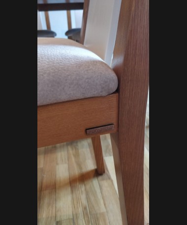 - Silla modelo TS0027, de estilo moderno, en madera de castaño, en acabado color am, con un detalle en blanco, y tapizada en tela de fácil limpieza blanca