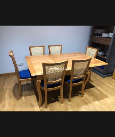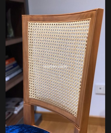 - Silla modelo TS0006, en madera de cerezo, en acabado color natural, tapiada en terciopelo azul