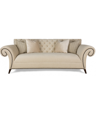 - Sofá modelo PSO0035, de estilo clásico hecho a medida, tapizado en tela de microfibras de fácil limpieza, con el respaldo de capitoné. Con detalles de tachuelas. Con patas de madera