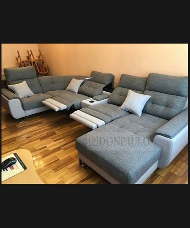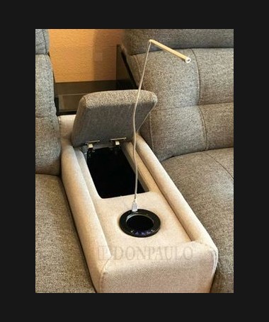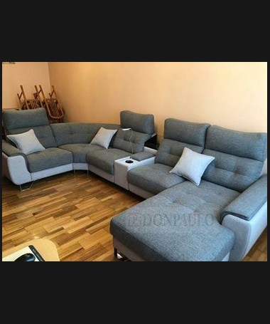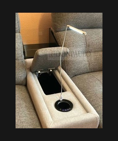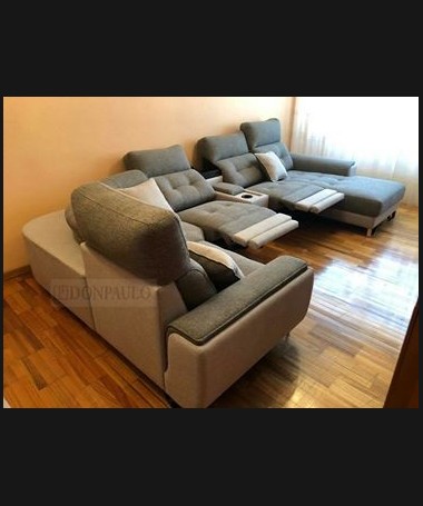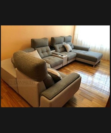 - Rinconera con chaisselonge modelo León TSO0030, de estilo moderno hecho a medida, con asientos de viscolatex, dos de ellos con motor relax, tapizado en tela de microfibras de fácil limpieza, con módulo posavasos con nevera incorporada, un pequeño arcón, cargador para el móvil y lámpara led
