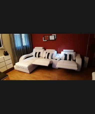 - Chaisselonge modelo TSO0049, de estilo moderno hecho a medida, tapizado en piel blanca, con dos asientos relax eléctricos, lámpara led y cargador para el móvil. Con dos arcones
