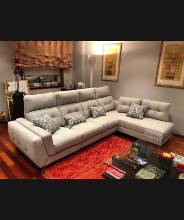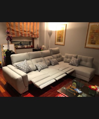 - Chaisselonge modelo París TSO0055, de estilo moderno hecho a medida, tapizado en tela de fácil limpieza Aquaclean. con 3 asientos de viscolatex relax a motor, y la pata decorativa de acero inoxidable