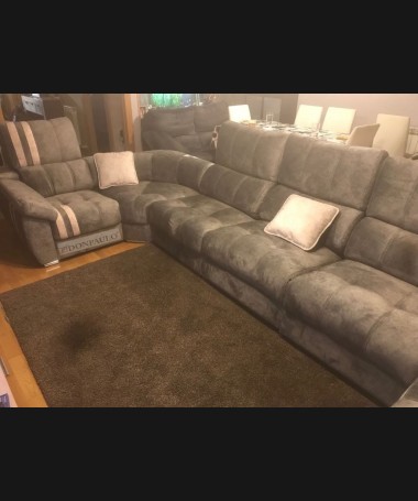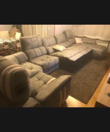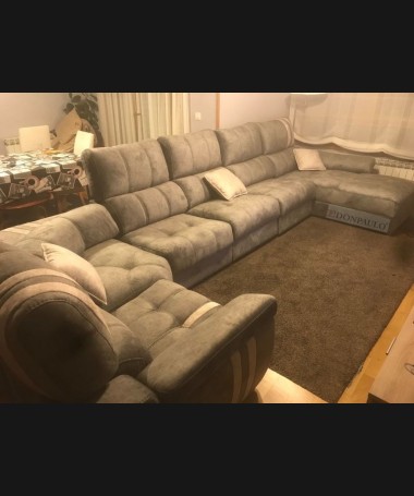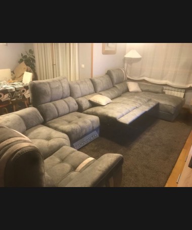- Rinconera con chaisselonge modelo Lisboa TSO0059, de estilo moderno hecho a medida, con los asientos de visco, tapizado en tela de microfibras gris, y detalles beige, con dos asientos relax eléctricos