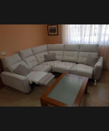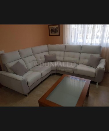 - Rinconera modelo León TSO0067, de estilo moderno hecho a medida, tapizado en tela Aquaclean de fácil limpieza, con un asiento relax eléctrico y dos asientos extraíbles