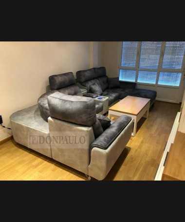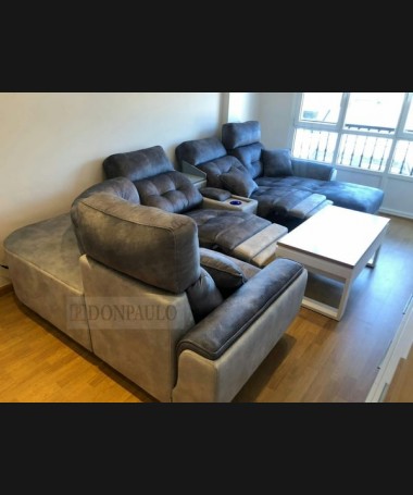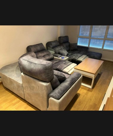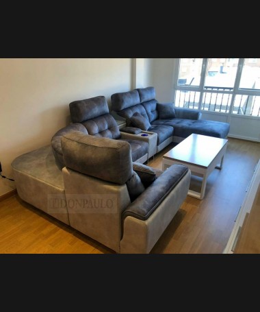 - Rinconera con chaisselonge modelo León TSO0079, de estilo moderno hecho a medida, tapizado en tela de microfibras de fácil limpieza sólo con agua, con los asientos de viscolatex, dos asientos relax eléctricos, módulo central con posavasos, arcó, revistero, cargador para el móvil y lámpara led